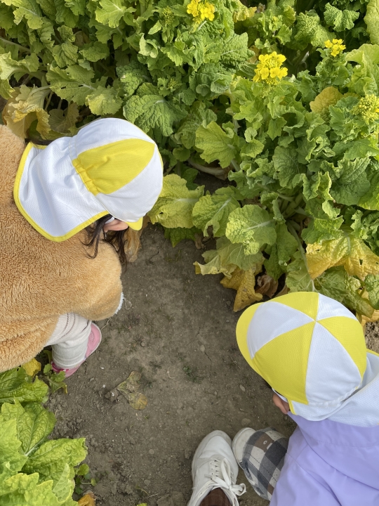ばら組さん(1歳児)つぼみ組さん(0歳児)が、菜の花を見に、お散歩へ行きました。