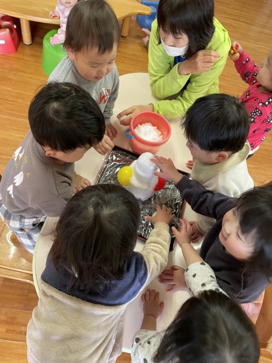 お部屋に雪を運んで、つんつんしたり、触ったり、におったりしました。