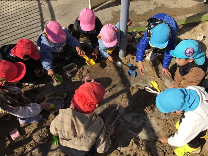 お兄さんお姉さんクラスは、園庭で雪遊び!お日様がでてきて、あっという間に雪が溶け、雪水遊びにかわりました。